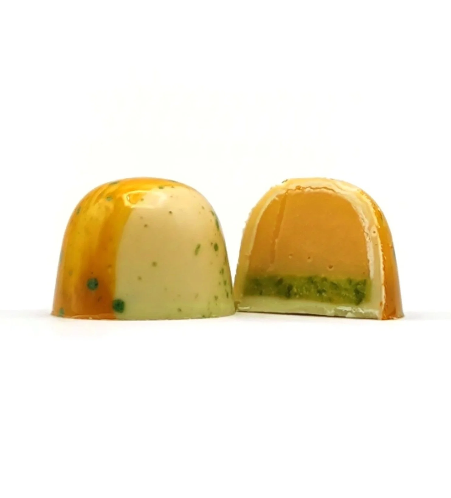 Tropically fresh and bursting with fruit and creamy white chocolate. Passionfruit puree with a mango white chocolate ganache is sealed in a white chocolate shell that explodes in your mouth.