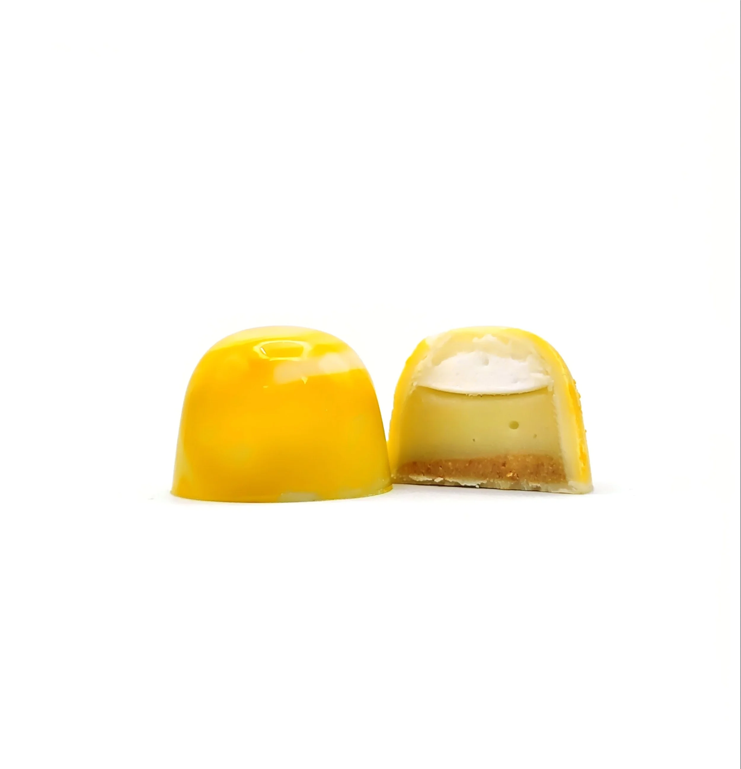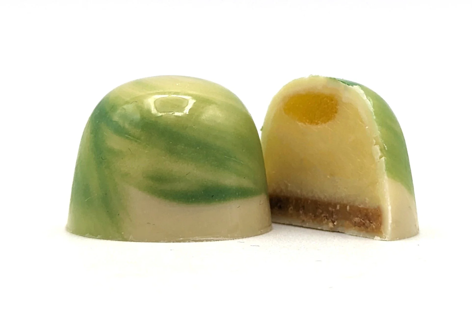 Lime fruit puree tops a white chocolate cheesecake layer with a biscuit bottom. They are all encased in a white chocolate shell which makes for a perfect meld of flavours and textures.