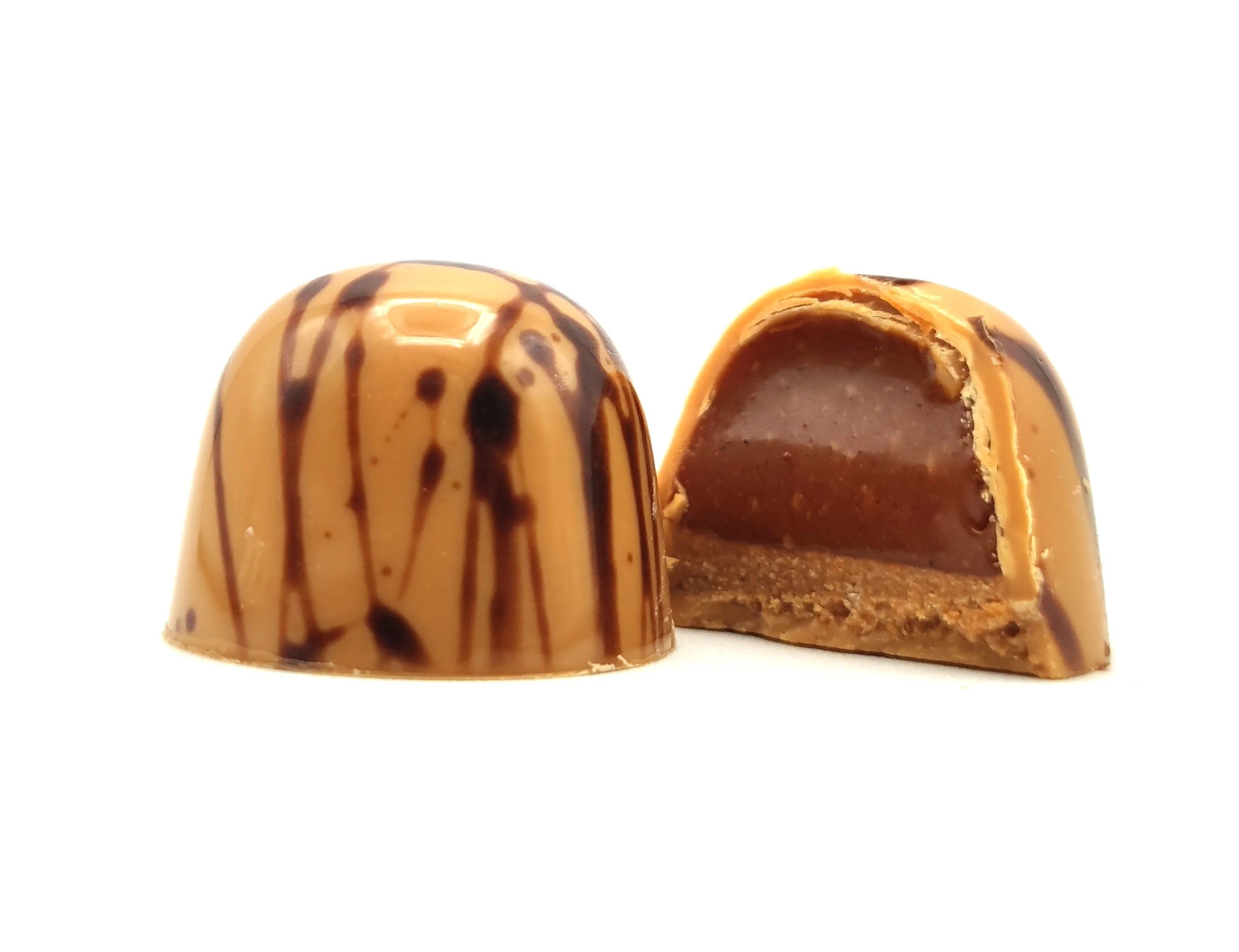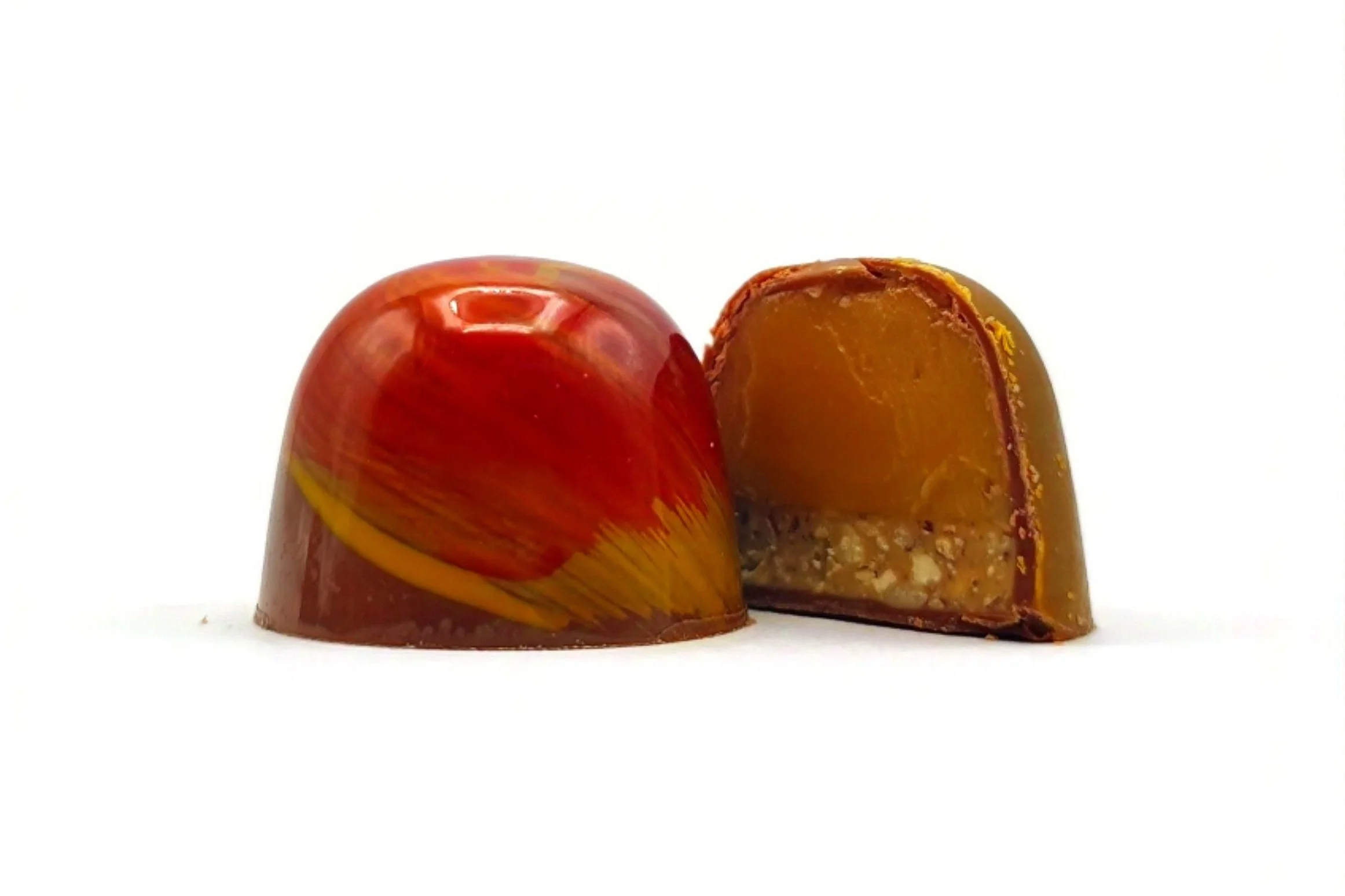 A crazy mixture that works so well! Peanut butter caramel with vanilla and just a hint of whisky, wrapped in a delicious Valrhona milk chocolate shell. Perfect for nutty fans!
