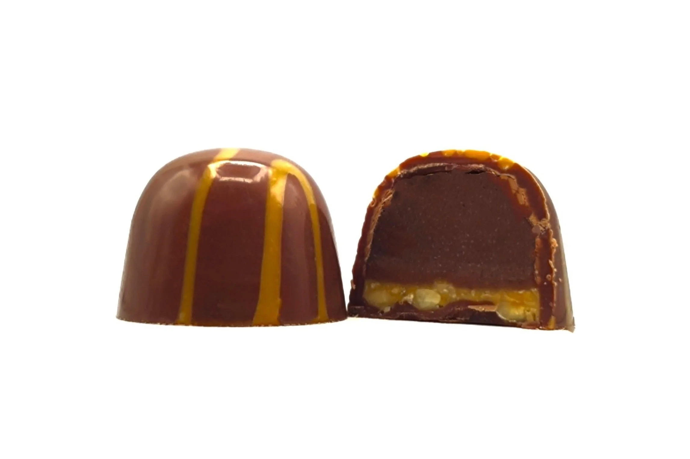 Rich, creamy and smooth hazelnut praline beneath which is a crunchy base adding texture and a satisfying bite, all wrapped up in a luxurious milk chocolate shell. A ‘must have’ for praline lovers.