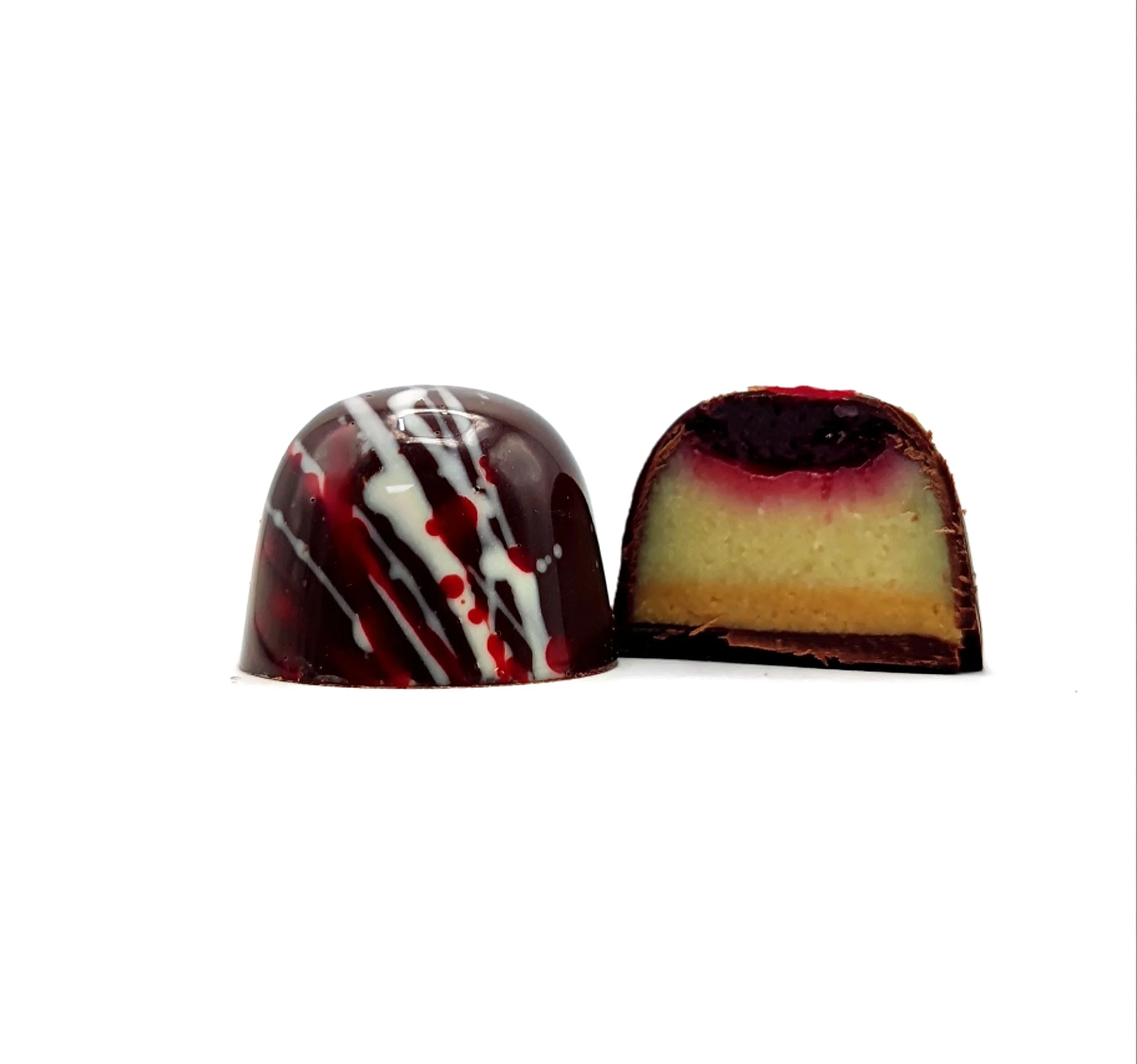 A strong cherry puree and almond ganache flavours burst from the dark chocolate shell and combined with the biscuit bottom, makes it a complete slice of bakewell tart in one bite!
